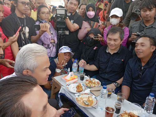 Dalam blusukannya Bacapres yang diusung dari partai PDIP ini langsung di sambut para relawan dan simpatisan. Lalu ganjar menyapa warga dan para pedagang pasar warakas