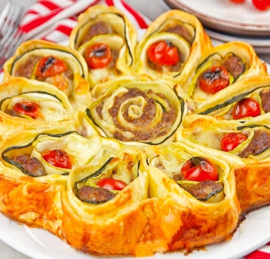 Top 10-12 garis puff pastry dengan sepotong zucchini dan bakso.