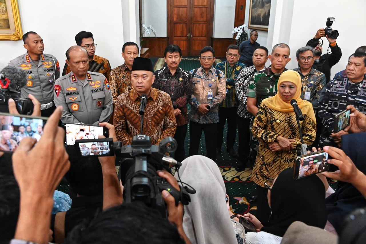 MATRASNEWS, SURABAYA – Menteri Perhubungan Dudy Purwagandhi bersama Gubernur Jawa Timur Khofifah Indar Parawansa menggelar rapat koordinasi persiapan Angkutan Lebaran 2026 di Gedung Negara Grahadi, Surabaya, Jumat (20/2). Langkah ini diambil untuk mengantisipasi lonjakan mobilitas masyarakat di wilayah Jawa Timur yang diprediksi menjadi salah satu pusat pergerakan utama nasional.