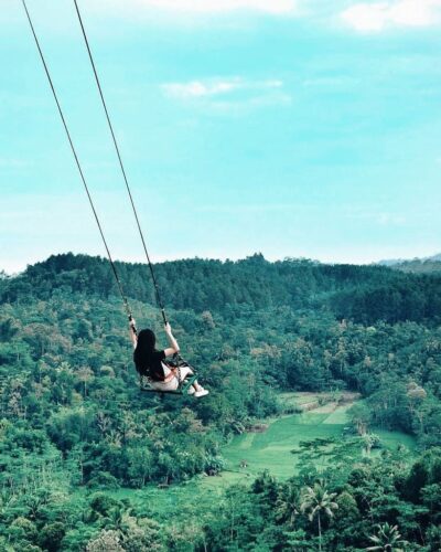 1. Berayun di tengah sejuknya udara Bandung yang berada di Sky Swing, The Lodge Maribaya, dengan latar hutan pinus.