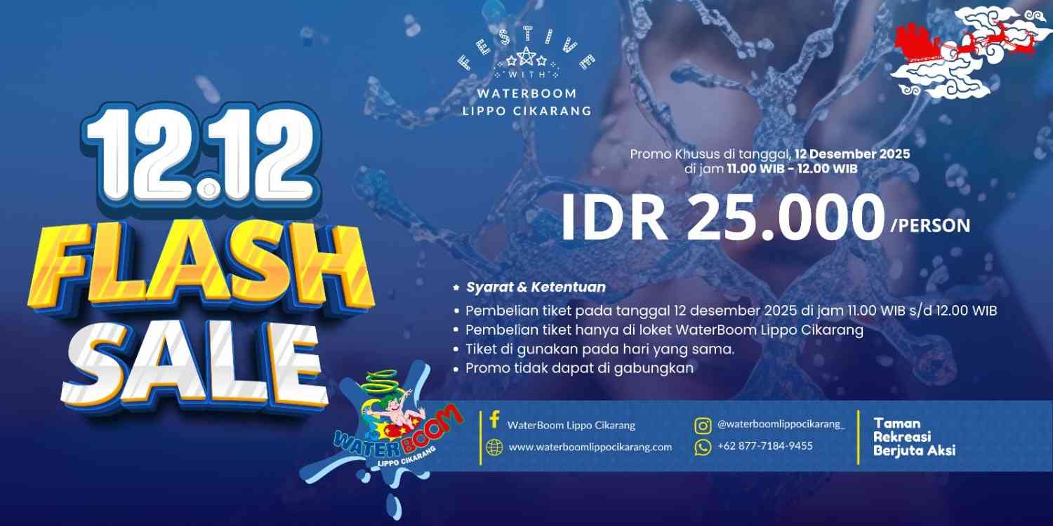 Promo 12.12 Flash Sale menawarkan tiket masuk dengan harga khusus Rp 25.000 per orang, yang hanya berlaku pada tanggal 12 Desember 2025. Pembelian tiket dapat dilakukan secara langsung di loket WaterBoom Lippo Cikarang pada pukul 11.00 hingga 12.00 WIB, dan tiket yang dibeli berlaku untuk digunakan pada hari yang sama. Kebijakan ini diterapkan untuk memastikan pelayanan tetap optimal serta menjaga kenyamanan pengunjung.